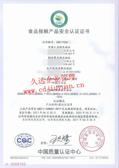 食品接觸產(chǎn)品安全認(rèn)證證書