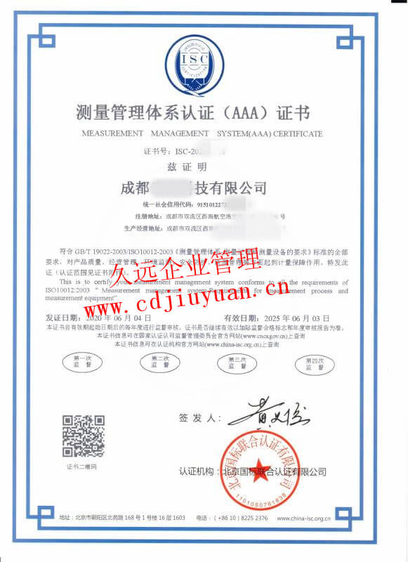 測(cè)量管理體系認(rèn)證證書